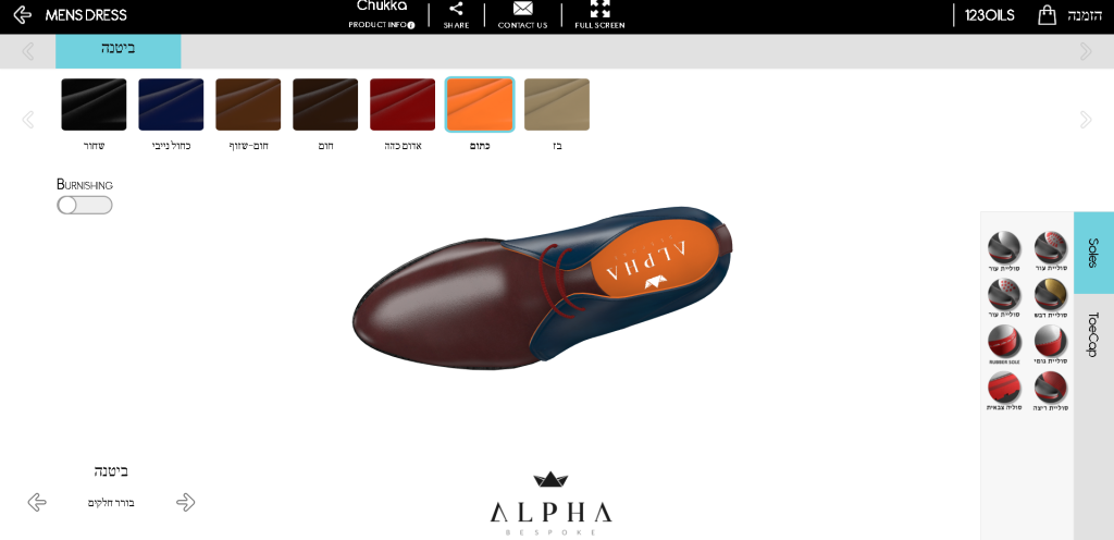 בכל פעולה שתעשה המערכת תשנה את הנעל בהתאם. תוכל לשנות את הנעל כמה פעמים שתרצה, ועד להשגת זוג הנעליים המושלם. לכשתסיים, השרטוט יישלח לאמנים שלנו בספרד, המייצרים את הנעליים שלנו בעבודת יד בדיוק לפי דרישת הלקוח בטווח משוער של 4-6 שבועות.