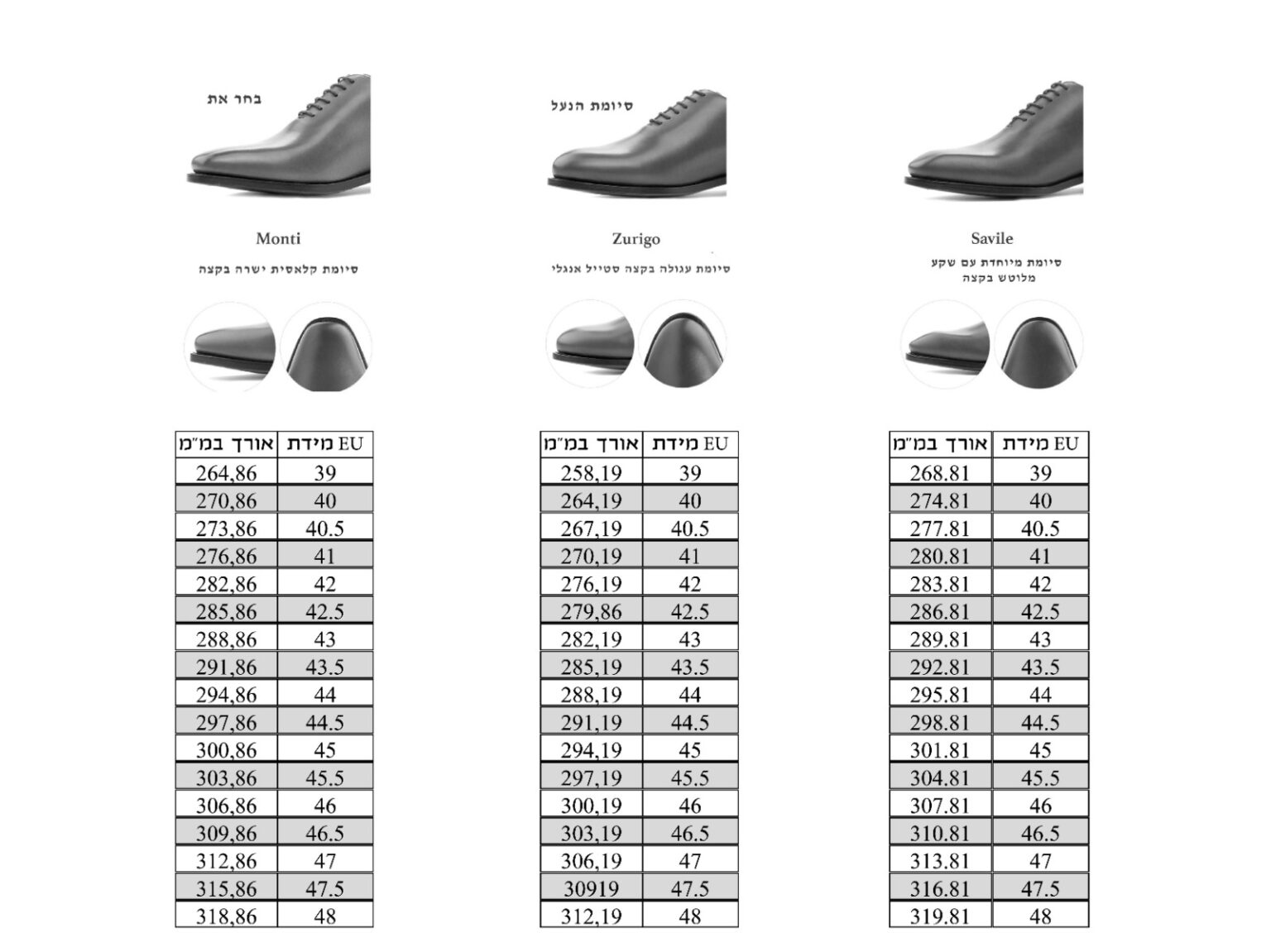 כדי שתקבל בדיוק את הנעליים שרצית ובמידה המתאימה לך, הכנו סרטון קצר שיעזור לך להבין מה המידה שלך. ניתן לעיין גם בטבלת המידות המצורפת בהמשך העמוד. אם אחרי הסרטון אתה עדיין לא מרגיש לגמרי בטוח ורוצה לנסות ולמדוד את הנעל פיזית על הרגל, נשמח לעזור – צור איתנו קשר כאן, ונשלח לך זוג נעלי מדידה עד הבית.